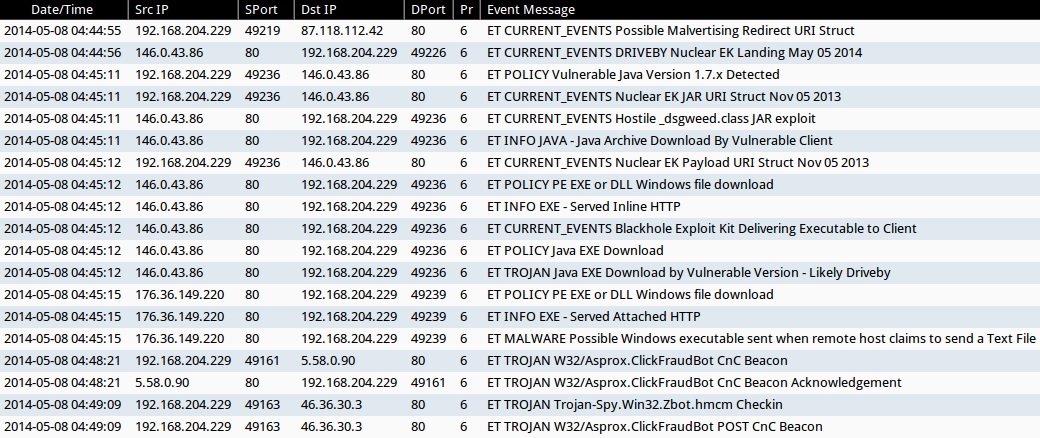 - 2014-05-08 04:44:56 UTC - 146.0.43[.]86:80 - ET CURRENT_EVENTS DRIVEBY Nuclear EK Landing May 05 2014
