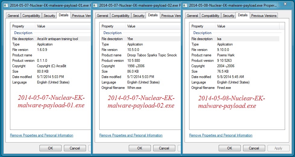 - VT link - a131140bf75bbb9c48f2995c6c98a279 - 82,776 bytes - 2014-05-07-Nuclear-EK-malware-payload-01.exe