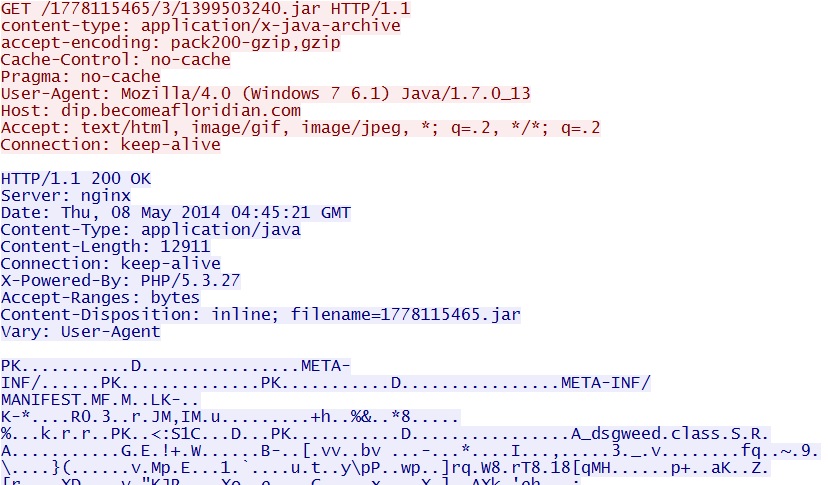 - 2014-05-08 04:45:11 UTC - 146.0.43[.]86:80 - ET CURRENT_EVENTS Hostile _dsgweed.class JAR exploit