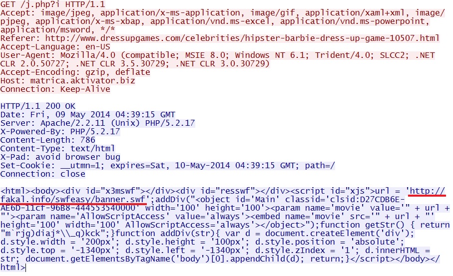 From matrica.aktivator[.]biz/j.php?i to fakal[.]info/swfeasy/banner.swf