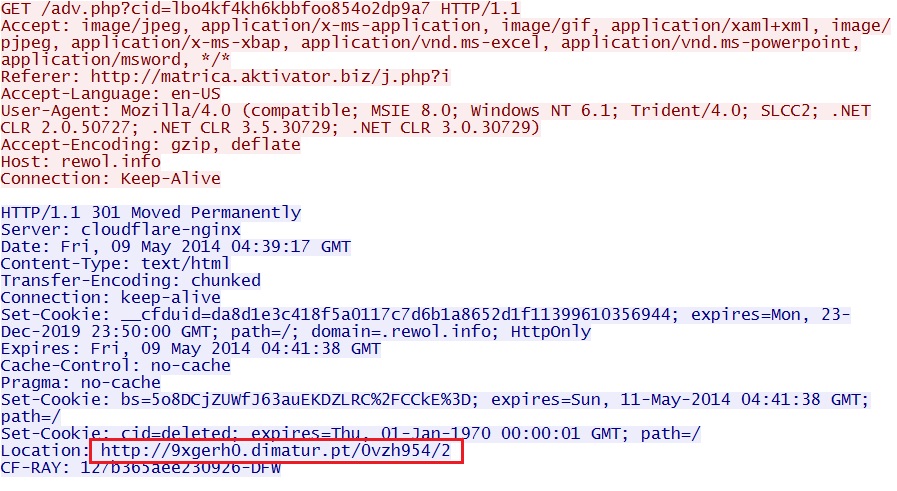 From fakal[.]info/swfeasy/banner.swf?cid=lbo4kf4kh6kbbfoo854o2dp9a7 to rewol[.]info/adv.php?cid=lbo4kf4kh6kbbfoo854o2dp9a7