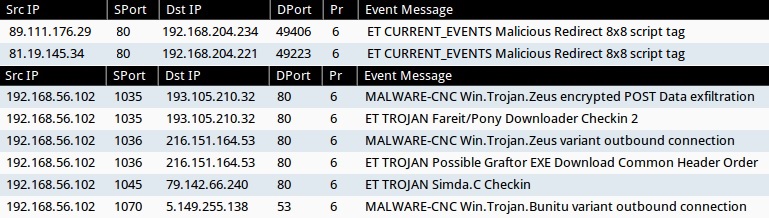 - I've left out the ET INFO and ET POLICY events--most organizations filter those out due to the large number of events from non-malicious traffic.