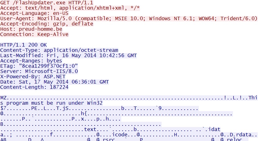 - 06:24:24 UTC - 23.91.112[.]4 - preud-homme[.]be - GET /FlashUpdater.exe