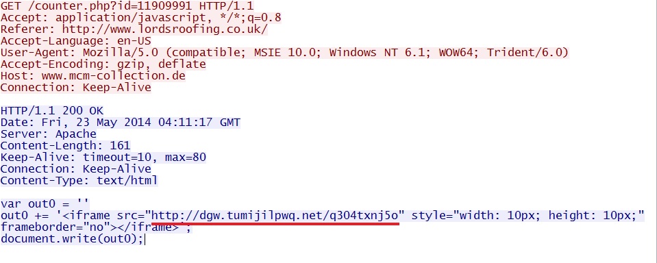 Each HTTP GET request for javascript from the compromised website included the same type of malicious code: