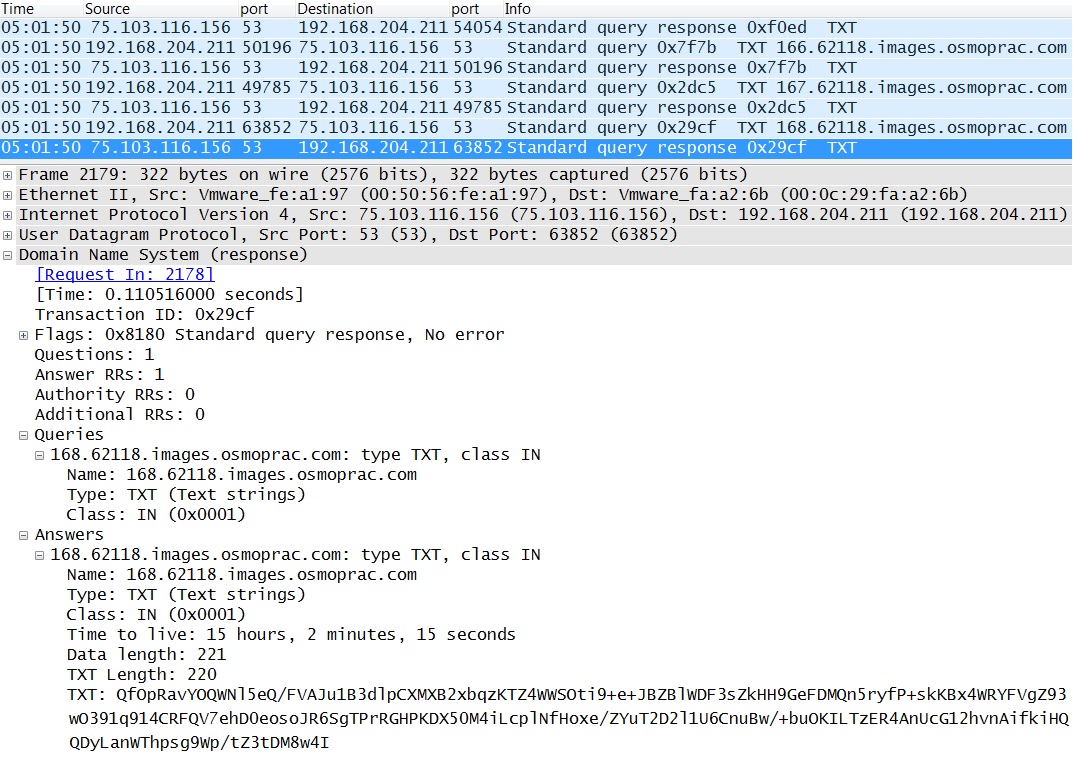 - 04:47:14 UTC - 75.103.116[.]156 port 53 - Query: 2.62118.images.osmoprac[.]com