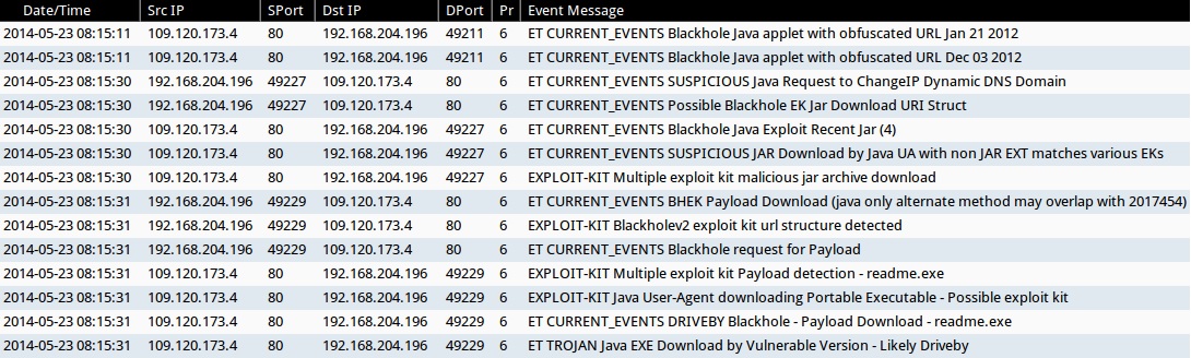 - 2014-05-23 08:15:30 UTC - 109.120.173[.]4:80 - ET CURRENT_EVENTS Possible Blackhole EK Jar Download URI Struct (sid:2017140)