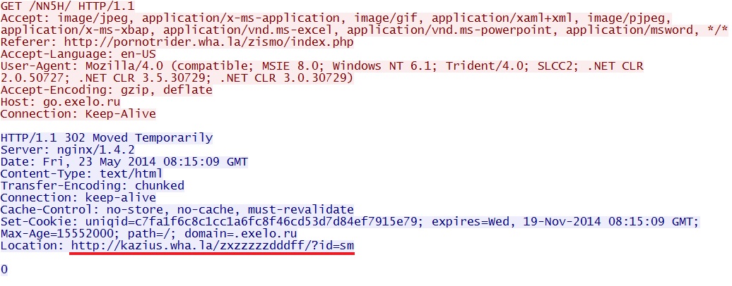 From ks.wha[.]la (second redirect) to go.exelo[.]ru (third redirect):
