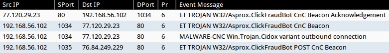 - 77.120.29[.]23:80 - ET TROJAN W32/Asprox.ClickFraudBot CnC Beacon Acknowledgement (sid:2018097)