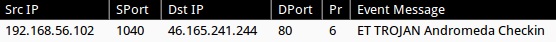 - 46.165.241[.]244:80 - ET TROJAN Andromeda Checkin (sid:2016223)
