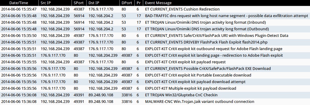 - 2014-06-06 15:35:50 UTC - 176.9.117[.]170:80 - ET CURRENT_EVENTS Safe/CritX/FlashPack URI with Windows Plugin-Detect Data (sid:2017812)