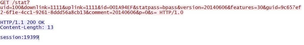 - 15:36:08 UTC - 89.248.90[.]108:33816 - GET /stat?uid=100&downlink=1111&uplink=1111&id=001A94EF&statpass=bpass&version=20140606&features=30&guid=9c657e