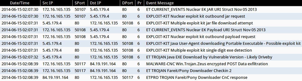 - 2014-06-15 02:07:30 UTC - 5.45.179[.]4:80 - ET CURRENT_EVENTS Nuclear EK JAR URI Struct Nov 05 2013 (sid:2017666)