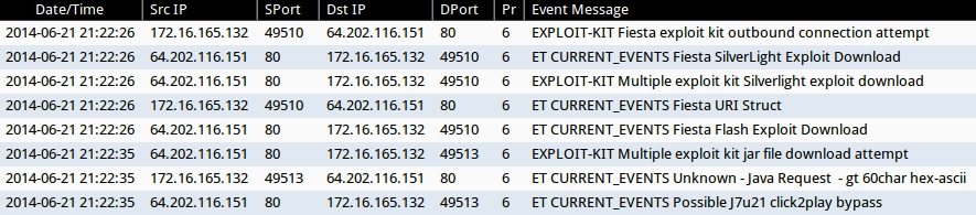 - 2014-06-21 21:22:26 UTC - 64.202.116[.]151:80 - EXPLOIT-KIT Fiesta exploit kit outbound connection attempt (sid:29443)