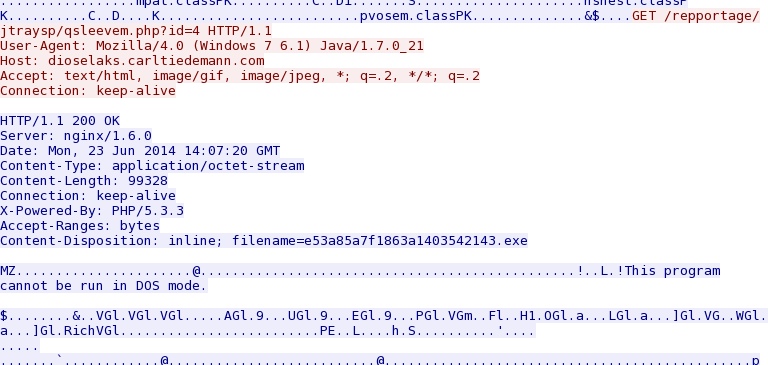 - 21:49:22 UTC - 46.21.159[.]163:80 - dioselaks.carltiedemann[.]com - GET /repportage/jtraysp/pstraitsb/c8e7bf6.jar
