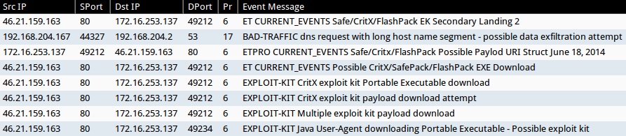 - 2014-06-23 18:59:19 UTC - 46.21.159[.]163:80 - ET CURRENT_EVENTS Possible CritX/SafePack/FlashPack EXE Download (sid:2017297)