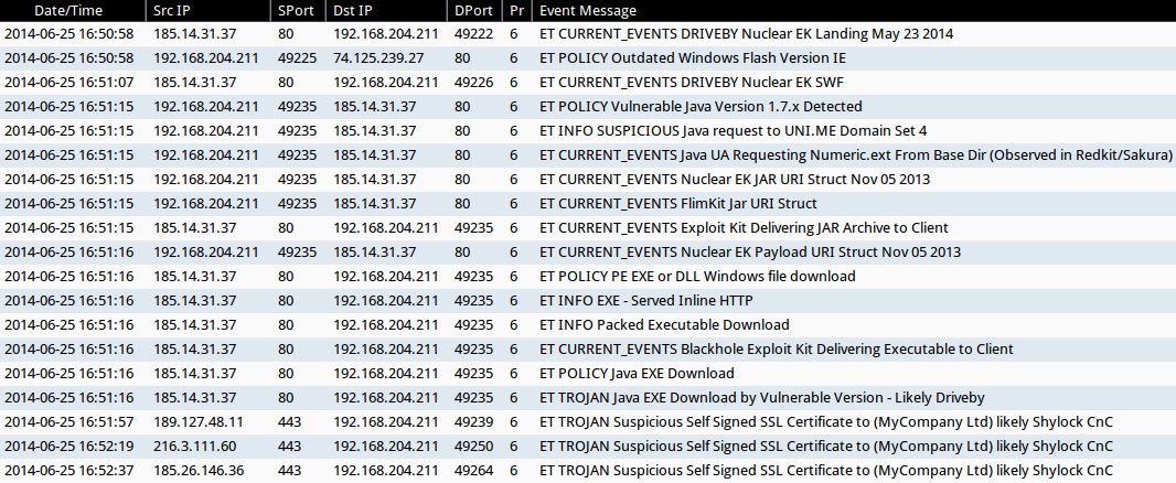 - 185.14.31[.]37:80 - ET CURRENT_EVENTS DRIVEBY Nuclear EK Landing May 23 2014 (sid:2018595)