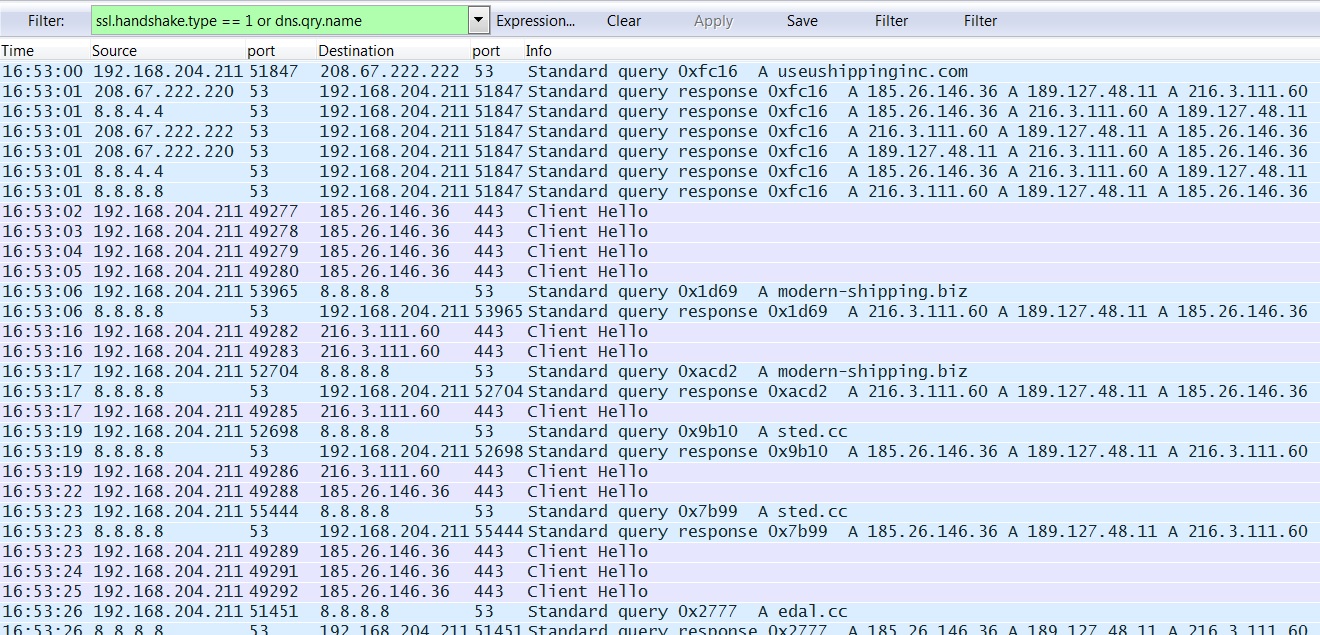 - 16:52:13 UTC - 8.8.8[.]8:53 - Standard query response 0x34f3 A 189.127.48[.]11 A 185.26.146[.]36 A 216.3.111[.]60