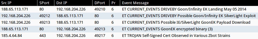 - 188.65.113[.]171:80 - ET CURRENT_EVENTS DRIVEBY Goon/Infinity EK Landing May 05 2014 (sid:2018440)