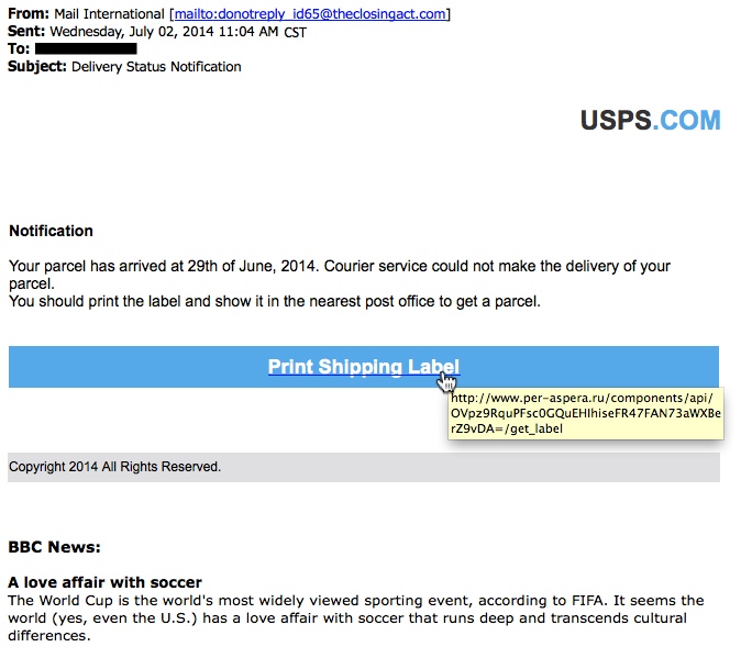 - https://threatpost.com/usps-spam-campaign-drops-botnet-malware/106393/