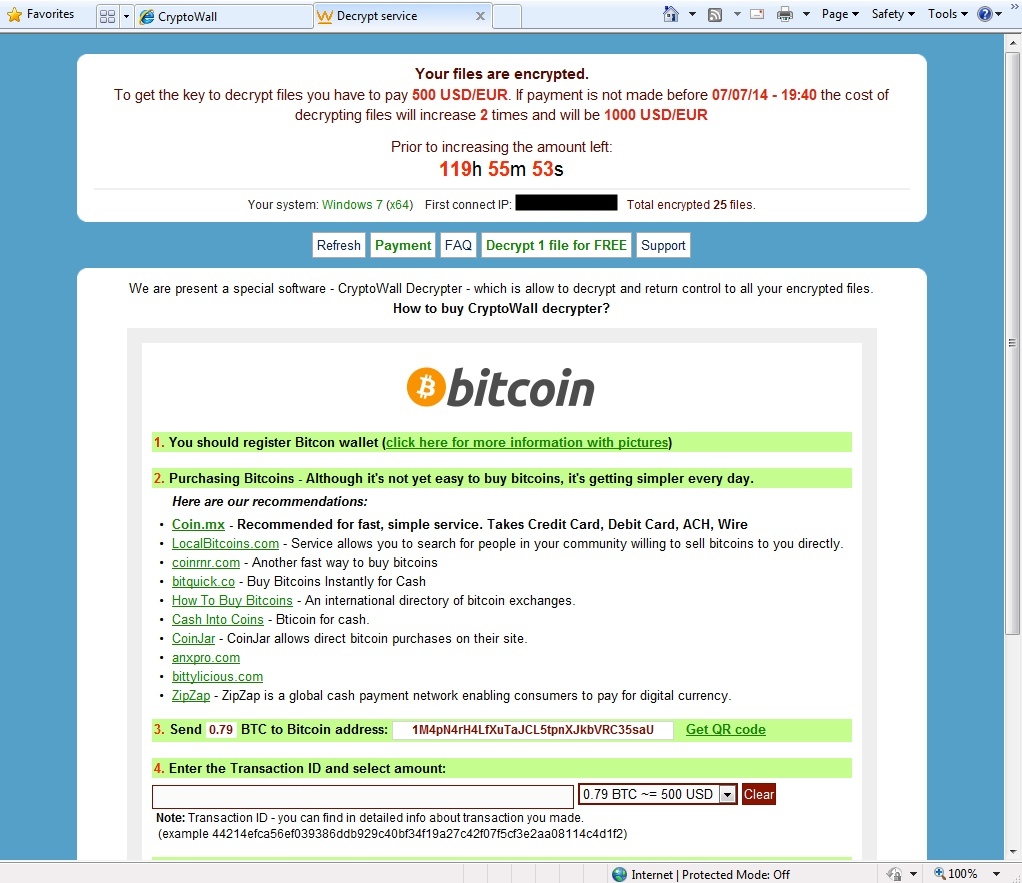 - The bitcoin address used by this particular CryptoWall ransomware is: 1M4pN4rH4LfXuTaJCL5tpnXJkbVRC35saU