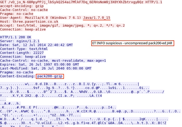 - 2014-07-12 22:41:46 UTC - 192.200.105[.]130:80 - ET INFO suspicious - uncompressed pack200-ed JAR (sid:2017909)