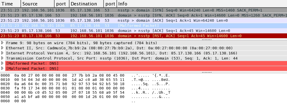 - 22:41:40 UTC - 85.17.138[.]166:53 - [RST, ACK]
