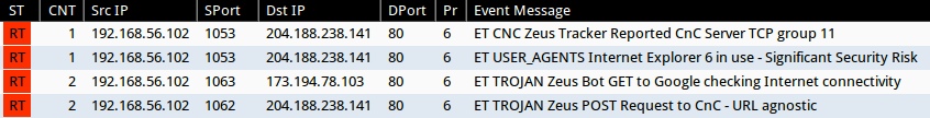 - 192.168.56.102: - 204.188.238[.]141:80 - ET TROJAN Zeus POST Request to CnC - URL agnostic (sid:2013976)