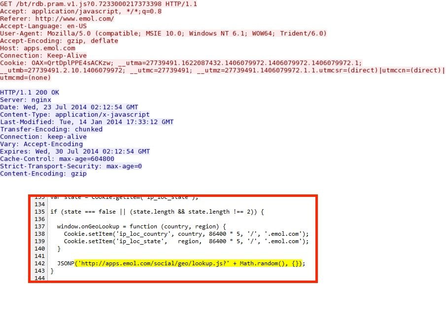 - 01:44:49 UTC - 184.154.117[.]170:80 - apps.emol[.]com - GET /social/geo/lookup.js?0.5267611857696085?callback=json1406079977174