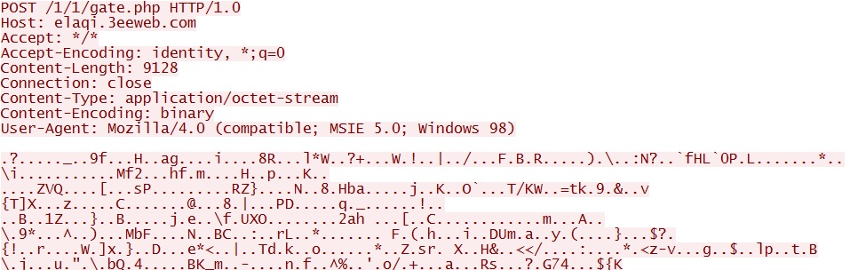- 2014-07-30 13:57:32 UTC - 185.28.21[.]30:80 - elaqi.3eeweb[.]com - POST /1/1/gate.php HTTP/1.0