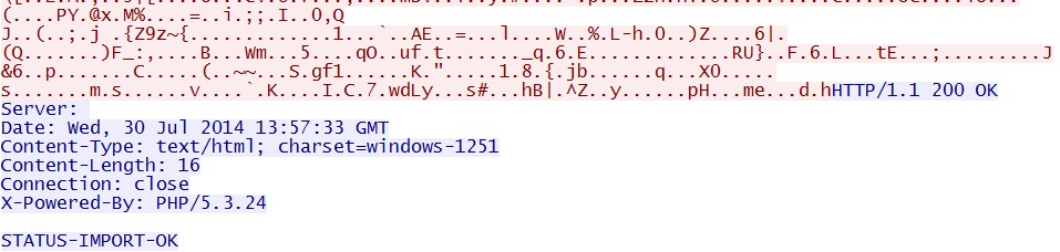- 185.28.21[.]30:80 - ET TROJAN Pony Downloader check-in response STATUS-IMPORT-OK (sid:2014563)