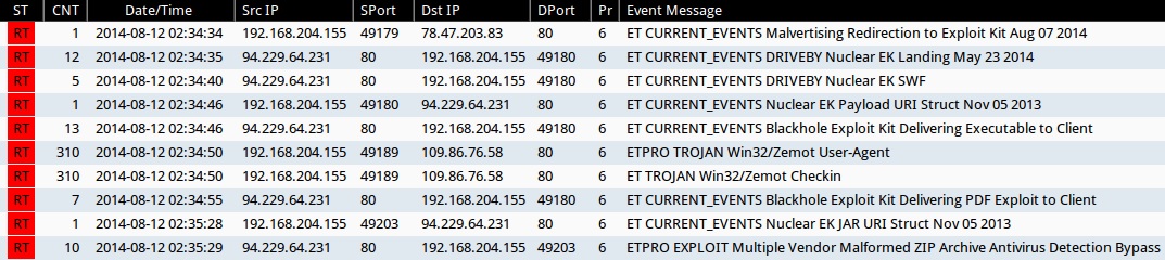 - 02:34:40 UTC - 94.229.64[.]231:80 - ET CURRENT_EVENTS DRIVEBY Nuclear EK SWF (sid:2018362)