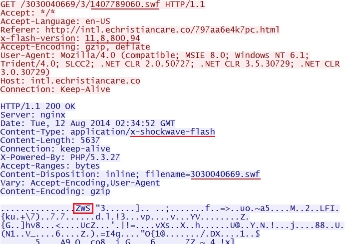 - 2014-08-12 02:34:40 UTC - 94.229.64[.]231:80 - intl.echristiancare[.]co - GET /3030040669/3/1407789060.swf