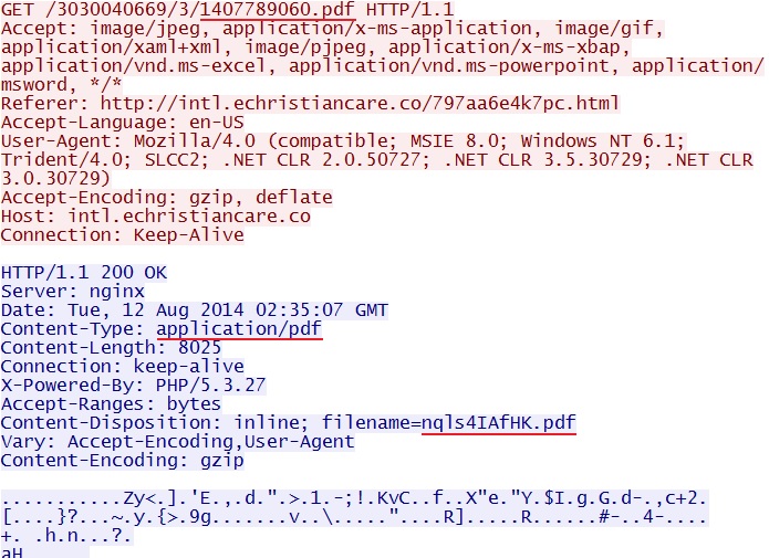 - 2014-08-12 02:34:55 UTC - 94.229.64[.]231:80 - intl.echristiancare[.]co - GET /3030040669/3/1407789060.pdf
