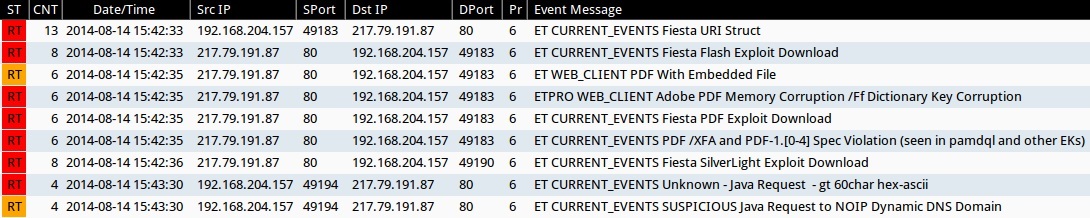 - 15:42:35 UTC - 217.79.191[.]87:80 - ET CURRENT_EVENTS Fiesta PDF Exploit Download (sid:2018408)