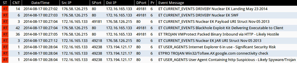 - 00:27:03 UTC - 176.58.126[.]215:80 - ET CURRENT_EVENTS DRIVEBY Nuclear EK SWF (sid:2018362)