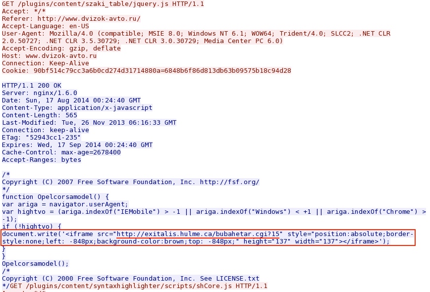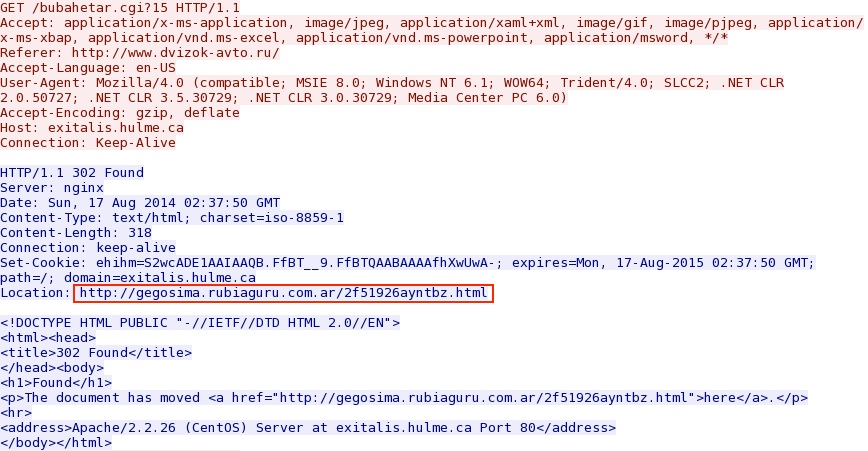 - 00:27:17 UTC - 176.58.126[.]215:80 - gegosima.rubiaguru[.]com[.]ar - GET /f/1/1408213320/3768244158/5/x0090407000700080150