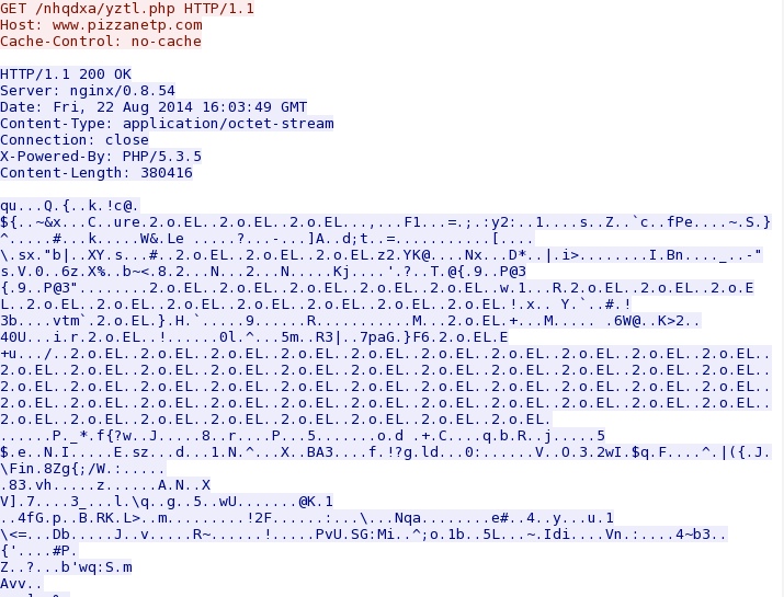 - 2014-08-22 16:03:49 UTC - 76.74.157[.]161:80 - www.pizzanetp[.]com - GET /nhqdxa/yztl.php [malware payload]