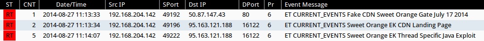 - 2014-08-27 11:14:07 UTC - 95.163.121[.]188:16122 - ET CURRENT_EVENTS Sweet Orange EK Thread Specific Java Exploit (sid:2018987)
