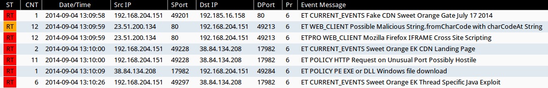 - 2014-09-04 13:10:00 UTC - 38.84.134[.]208:17982 - ET CURRENT_EVENTS Sweet Orange EK CDN Landing Page (sid:2018786)