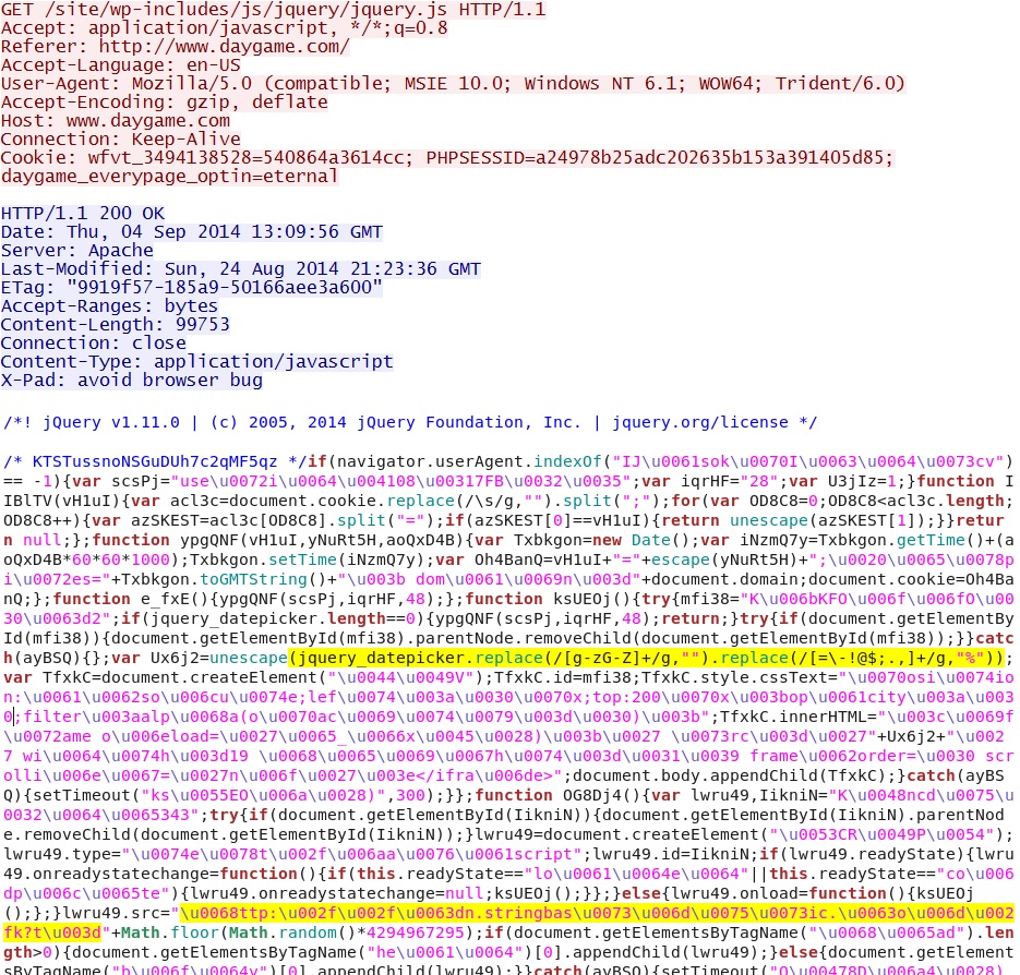 - 2014-09-04 13:09:56 UTC - 91.208.99[.]138:80 - www.daygame[.]com - GET /site/wp-includes/js/jquery/jquery.js