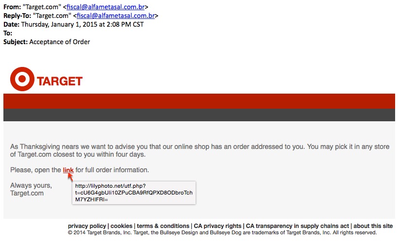 As Thanksgiving nears we want to advise you that our online shop has an order addressed to you. You may pick it in any store of Target[.]com closest to you within four days.